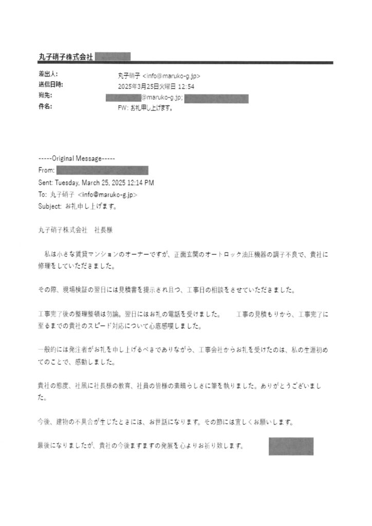 丸子社長宛にオーナー様より、お褒めのメールを頂きました。